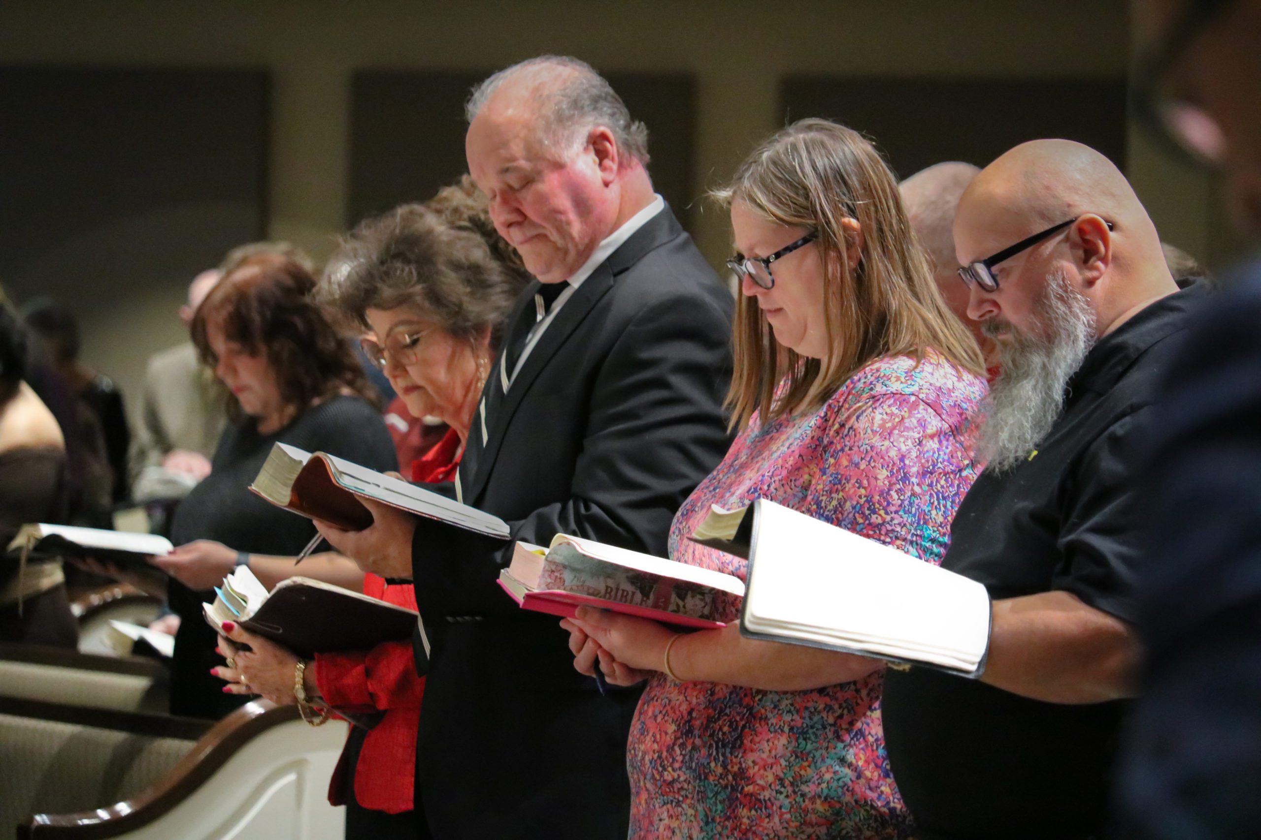 Assembling together to worship the Lord in music, service, giving, prayer, and testimonies.